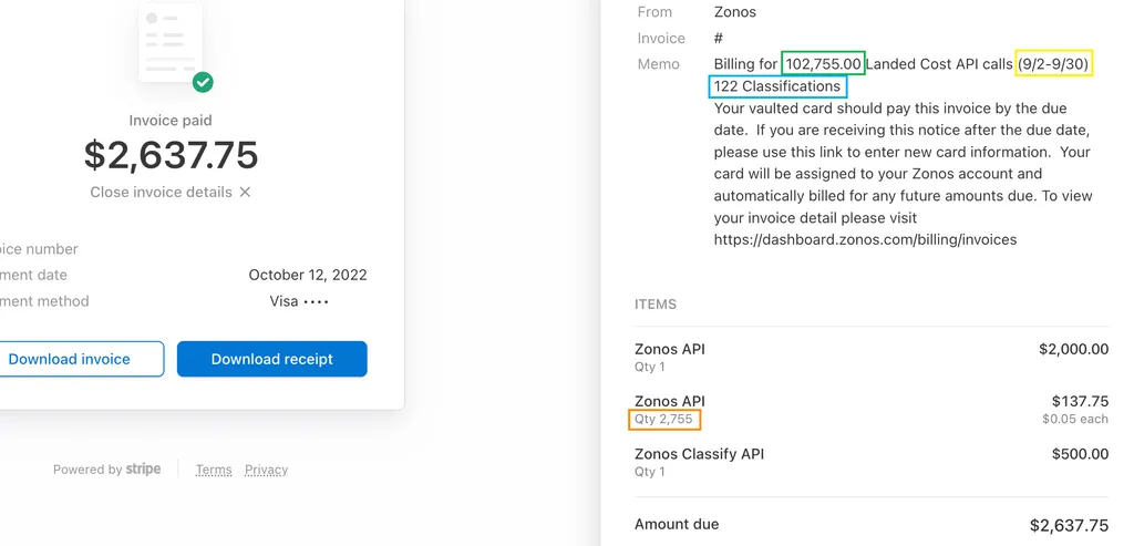 The number of API calls during that month is viewable in the memo and itemized sections of the invoice. The image below highlights the following: